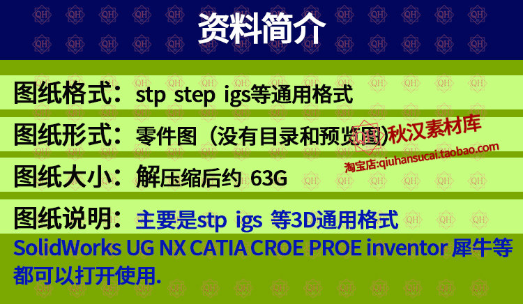 里面模型是stp step igs等通用格式目录,SW UG NX CATIA CROE PROE inventor等3D软件都可以打开使用哦。